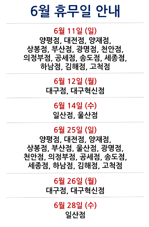 6/12, 6/26 - 남대구점, 내당점, 논산점, 대구수성점, 동촌점, 상인점, 성서점, 영주점, 칠곡점